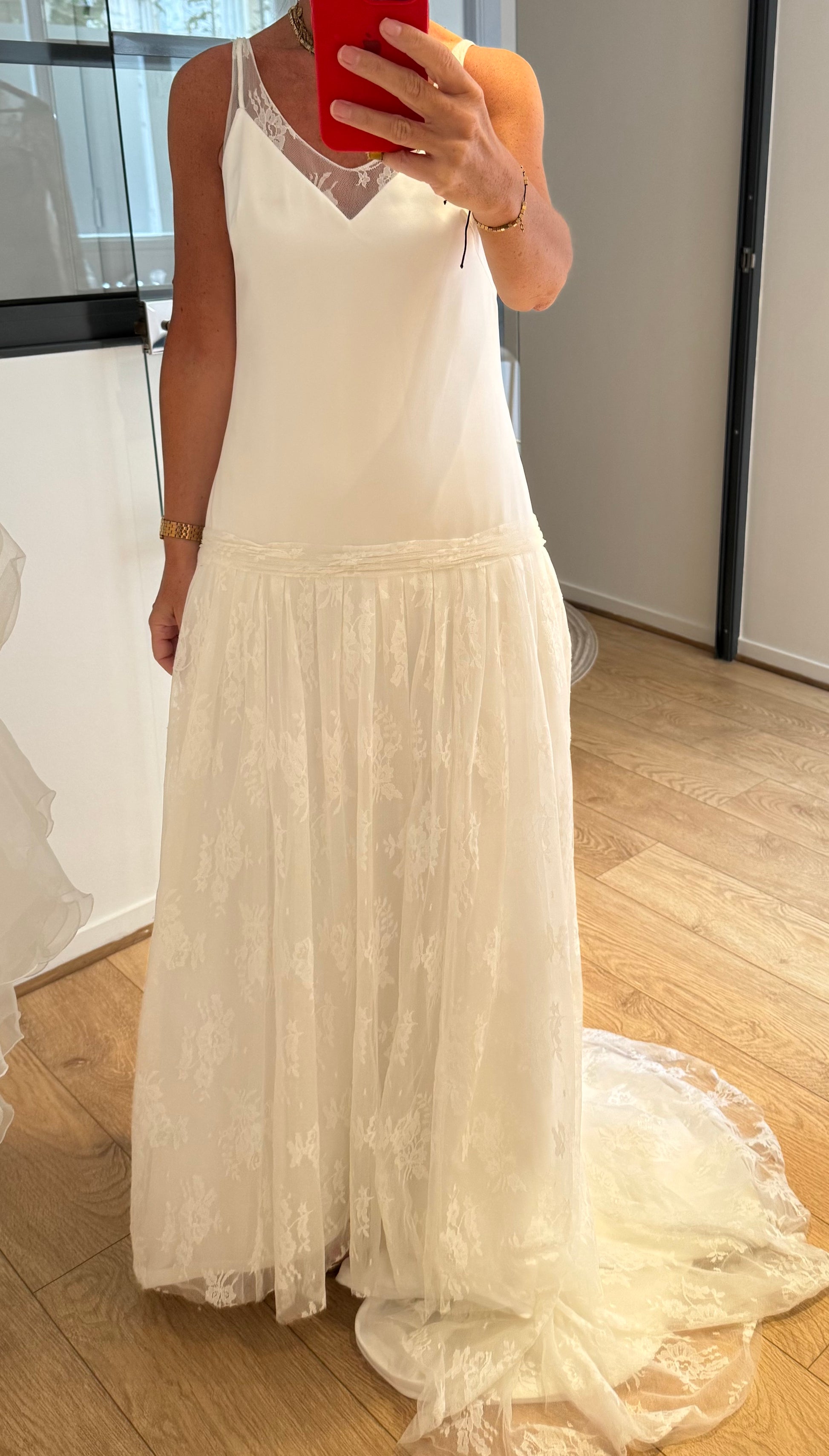 Élégante et pleine de charme, cette robe bohème allie la légèreté de la soie à la délicatesse de la dentelle de Calais, véritable emblème du savoir-faire français.