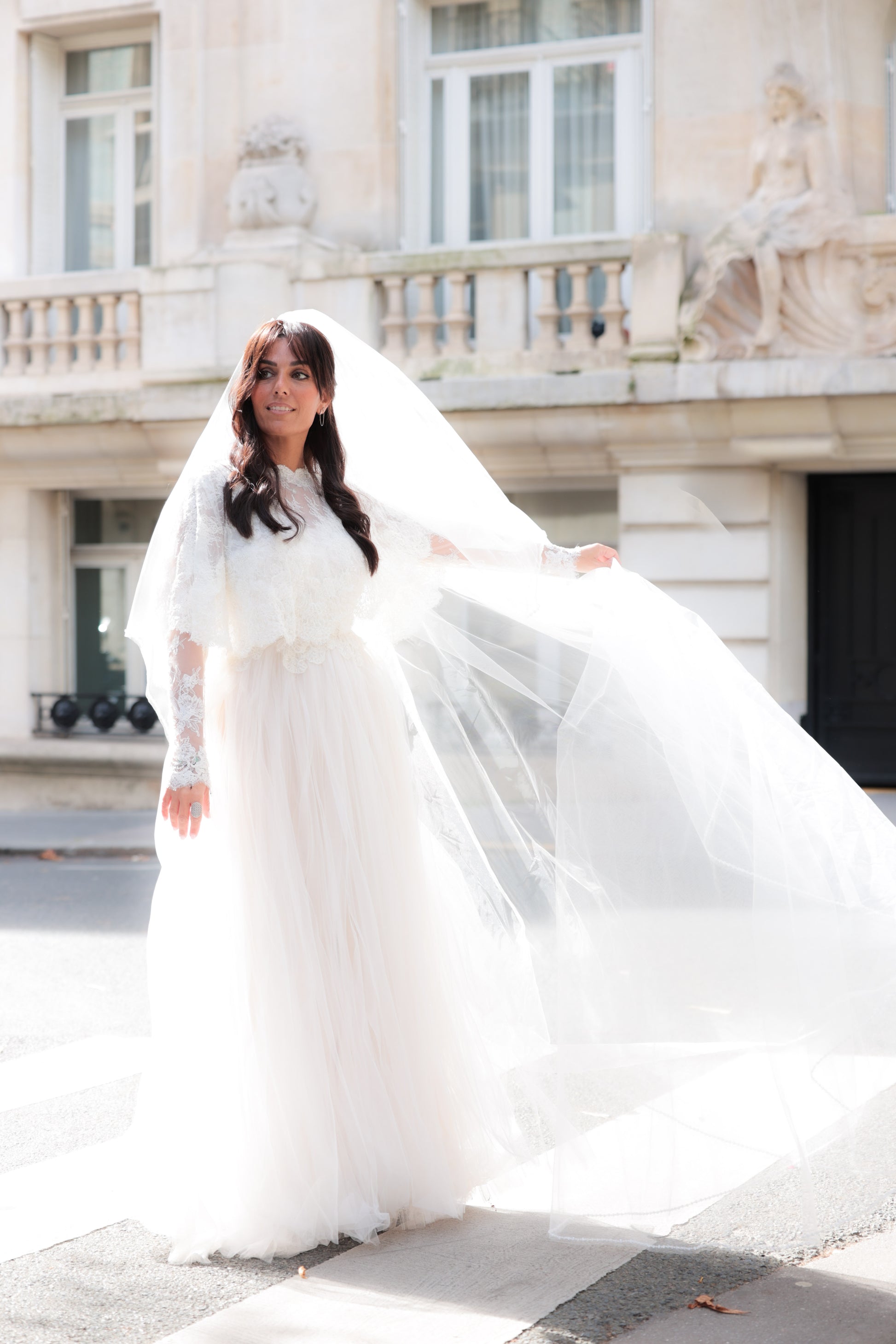 La jupe en tulle fluide est agrémentée de jolis pans, apportant légèreté et mouvement à la silhouette.