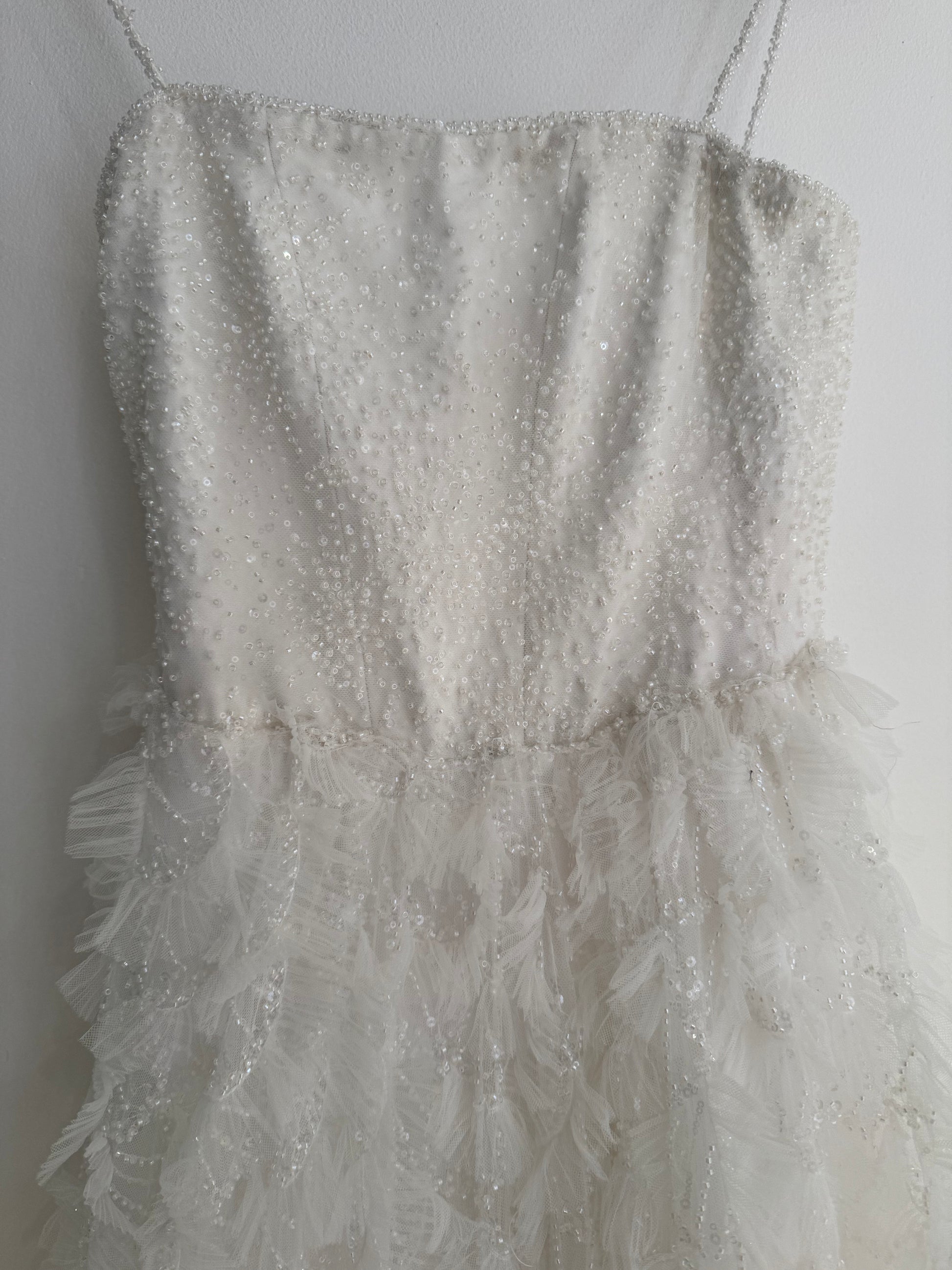 Robe d’exception signée Nathalie Ettedgui. Son bustier orné de perles délicates sublime le décolleté, tandis que de fines bretelles perlées assurent un maintien à la fois discret et élégant.