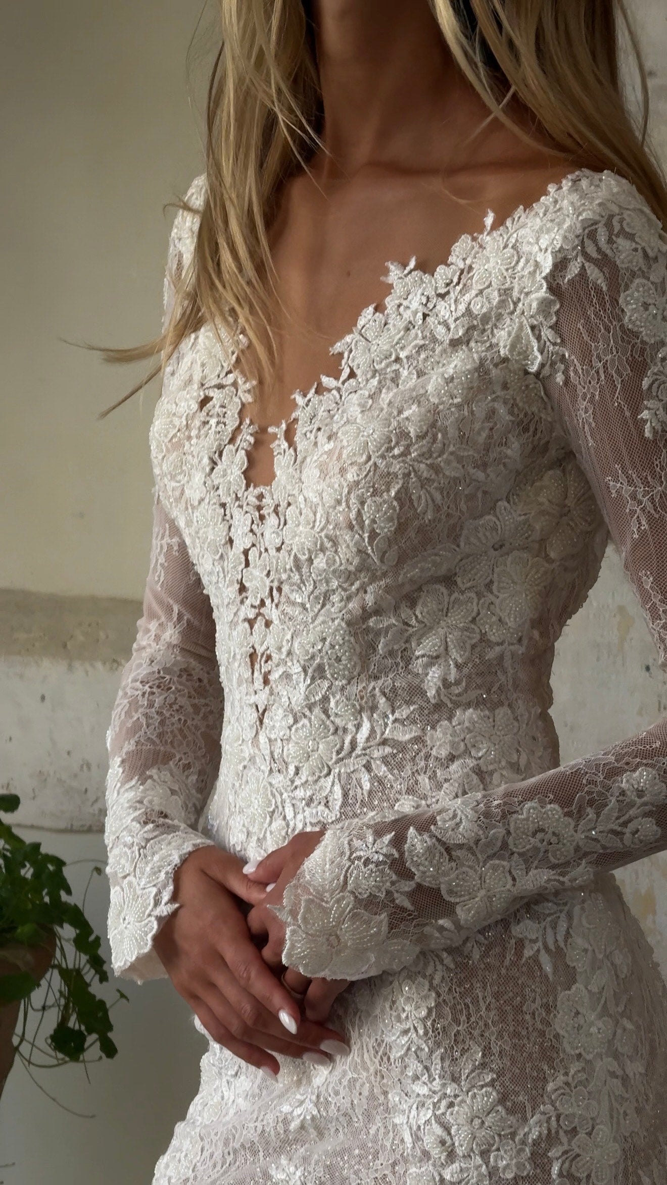 Confectionnée dans une dentelle délicate, cette robe présente un jeu subtil de motifs floraux et de transparence, apportant une dimension luxueuse et raffinée. Le bustier, orné d’un décolleté en V, est structuré pour un maintien optimal tout en mettant en valeur le buste.