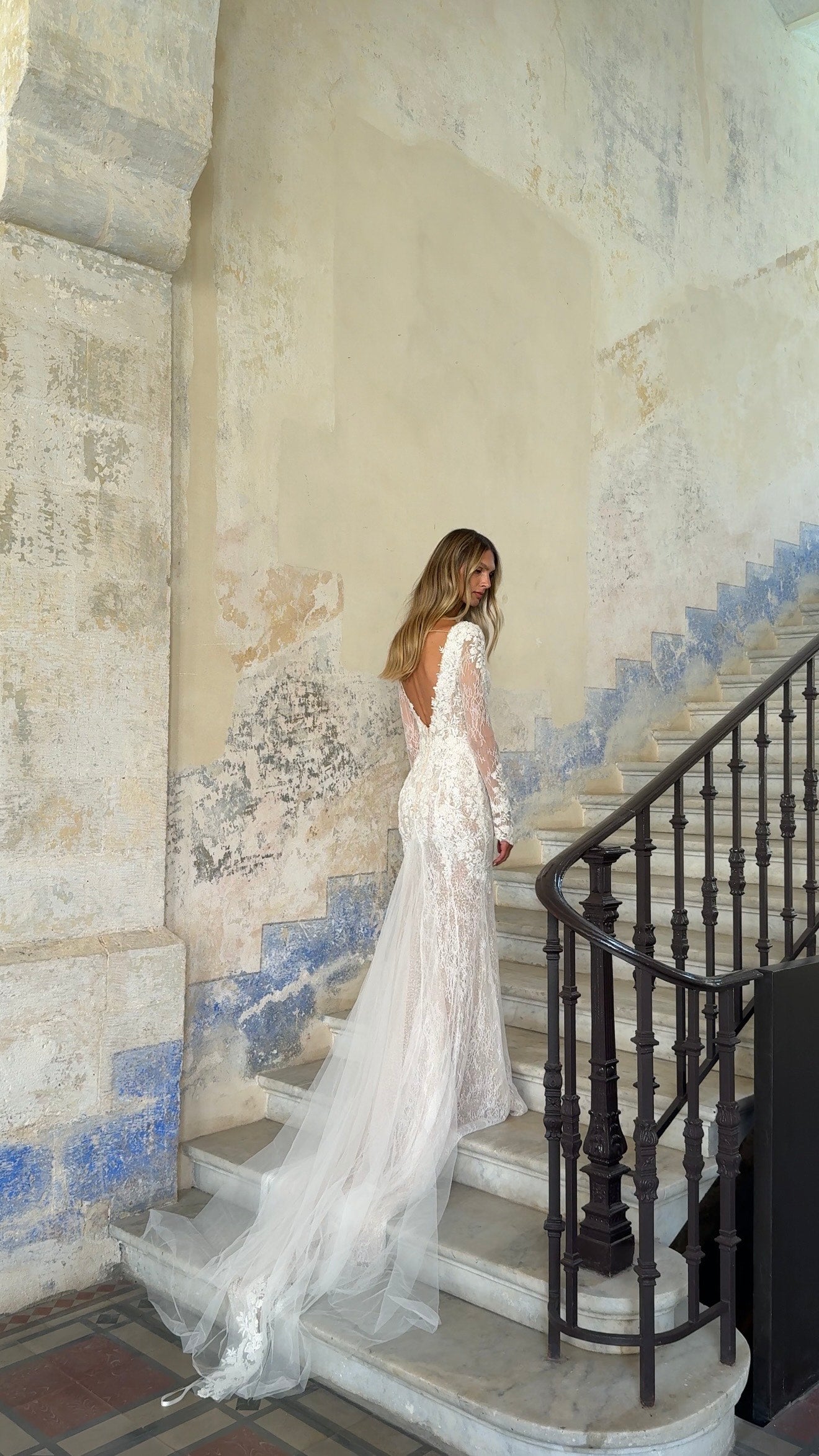 La traîne fluide et majestueuse ajoute une note de solennité à l’ensemble, la robe est accompagnée d’une sur-jupe amovible, en tulle vaporeux qui crée un volume digne d’un conte de fées.