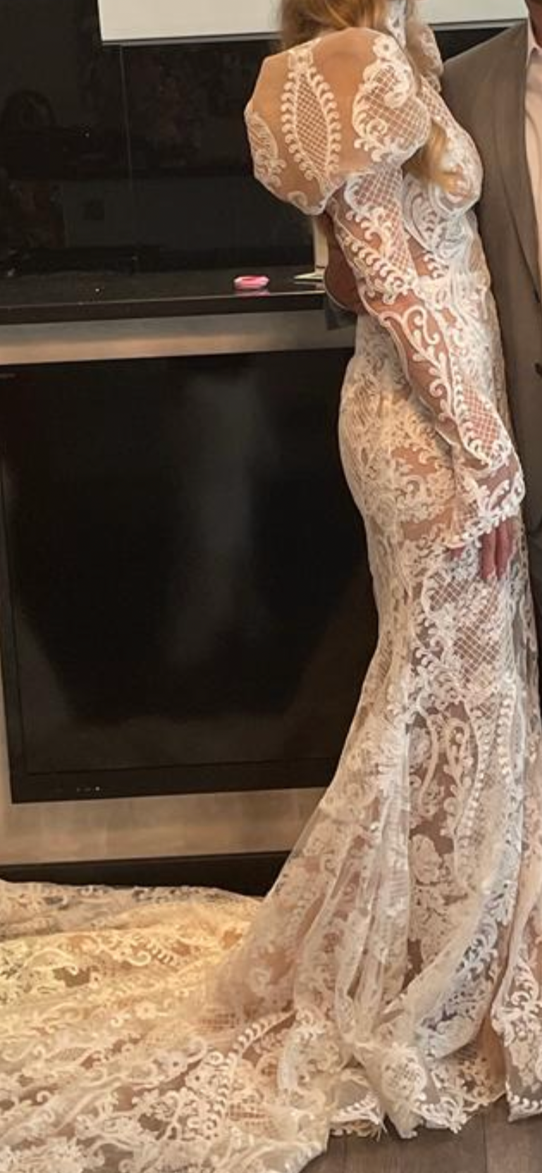 Les manches longues et bouffantes, en dentelle transparente, apportant une touche romantique et théâtrale. Sa longue traîne majestueuse, en dentelle entièrement travaillée, et son dos nu subliment la peau sans vulgarité, offrant un équilibre parfait entre romantisme et audace.