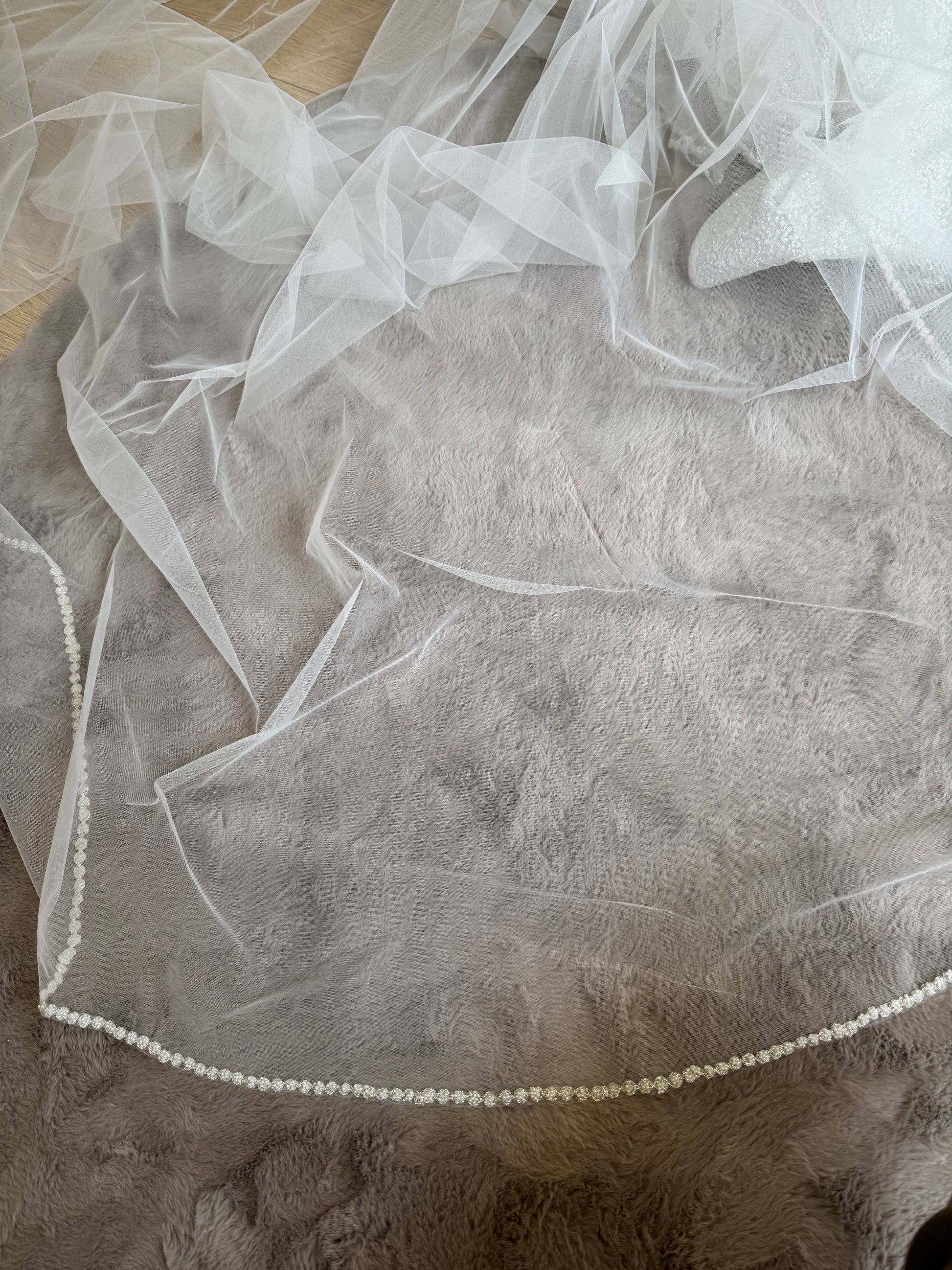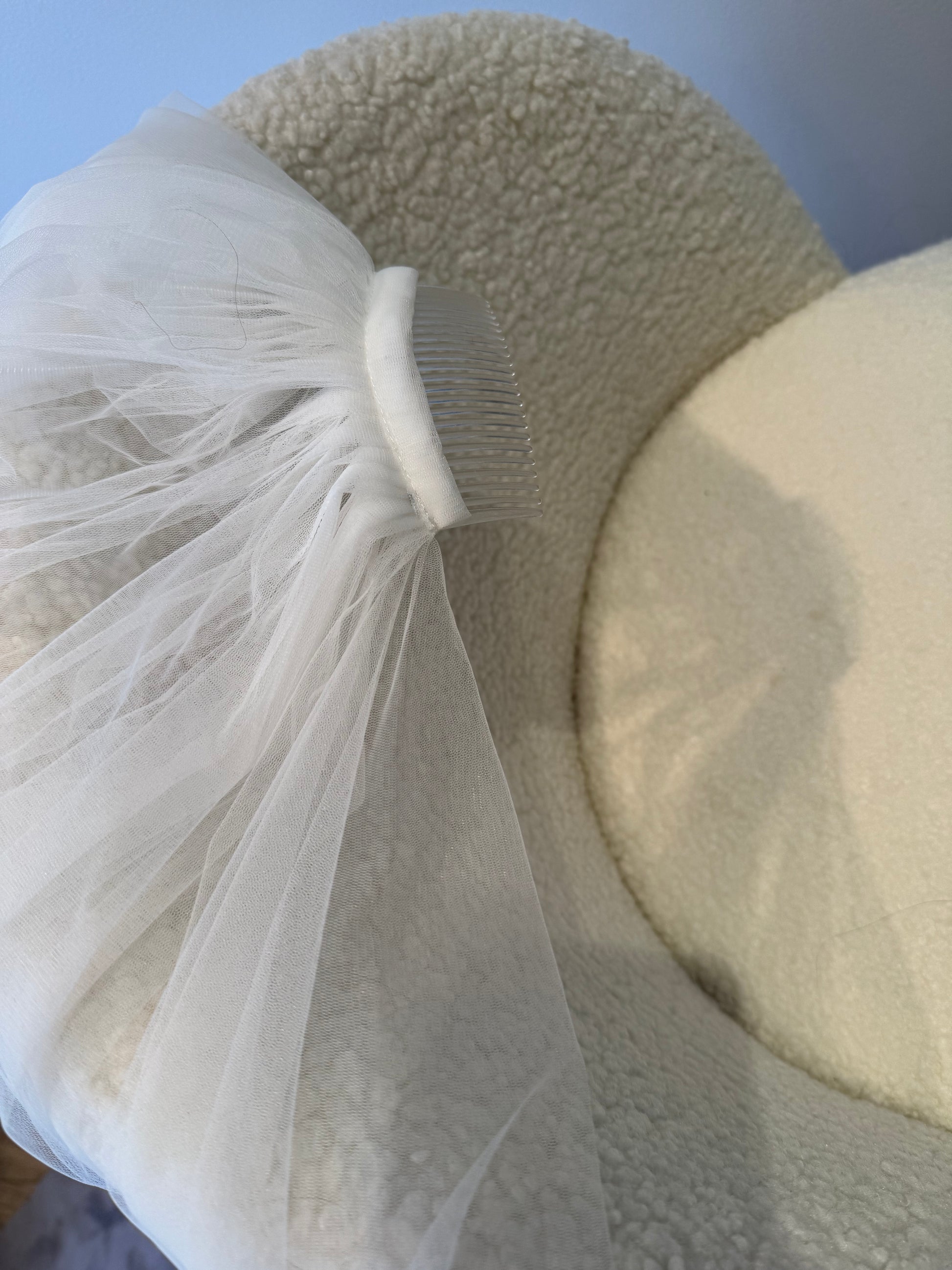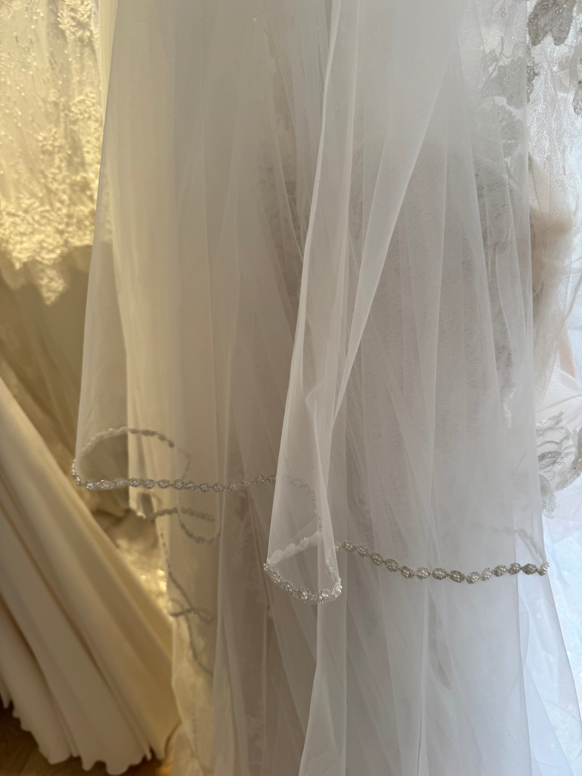 Ce voile raffiné en tulle blanc se distingue par son rabat délicatement orné de perles et de paillettes, apportant une touche de lumière et d’élégance à votre coiffure. Il est fixé à l’aide d’un peigne intégré, assurant une tenue parfaite tout au long de la journée.